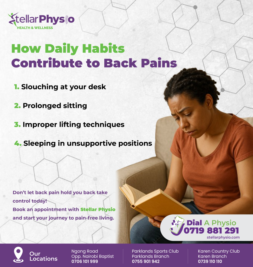 Many people unknowingly develop habits that contribute to back pain. Here are some of the most common culprits: