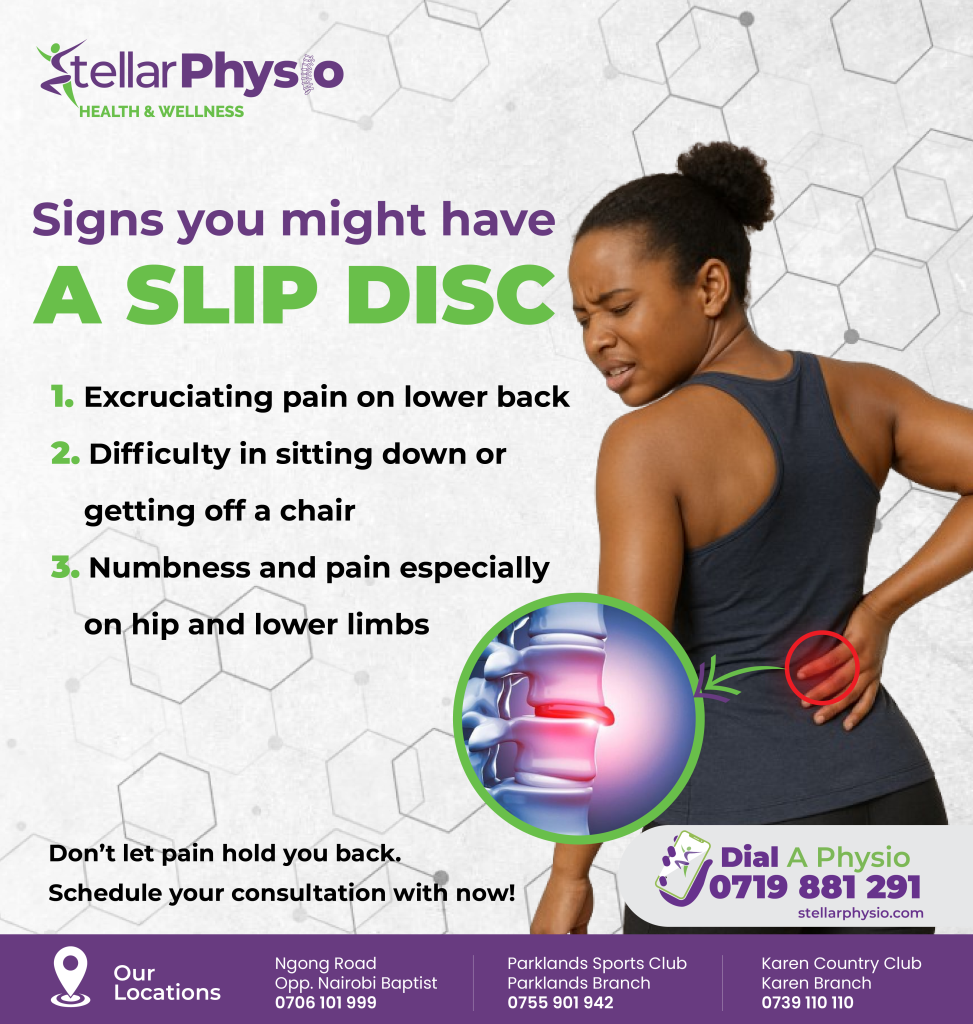 If you’re experiencing signs of a slipped disc, don’t wait until the pain worsens. At Stellar Physio, our expert team provides specialized physiotherapy in Nairobi to help you recover effectively. Book your session today and take the first step towards a pain-free life!
